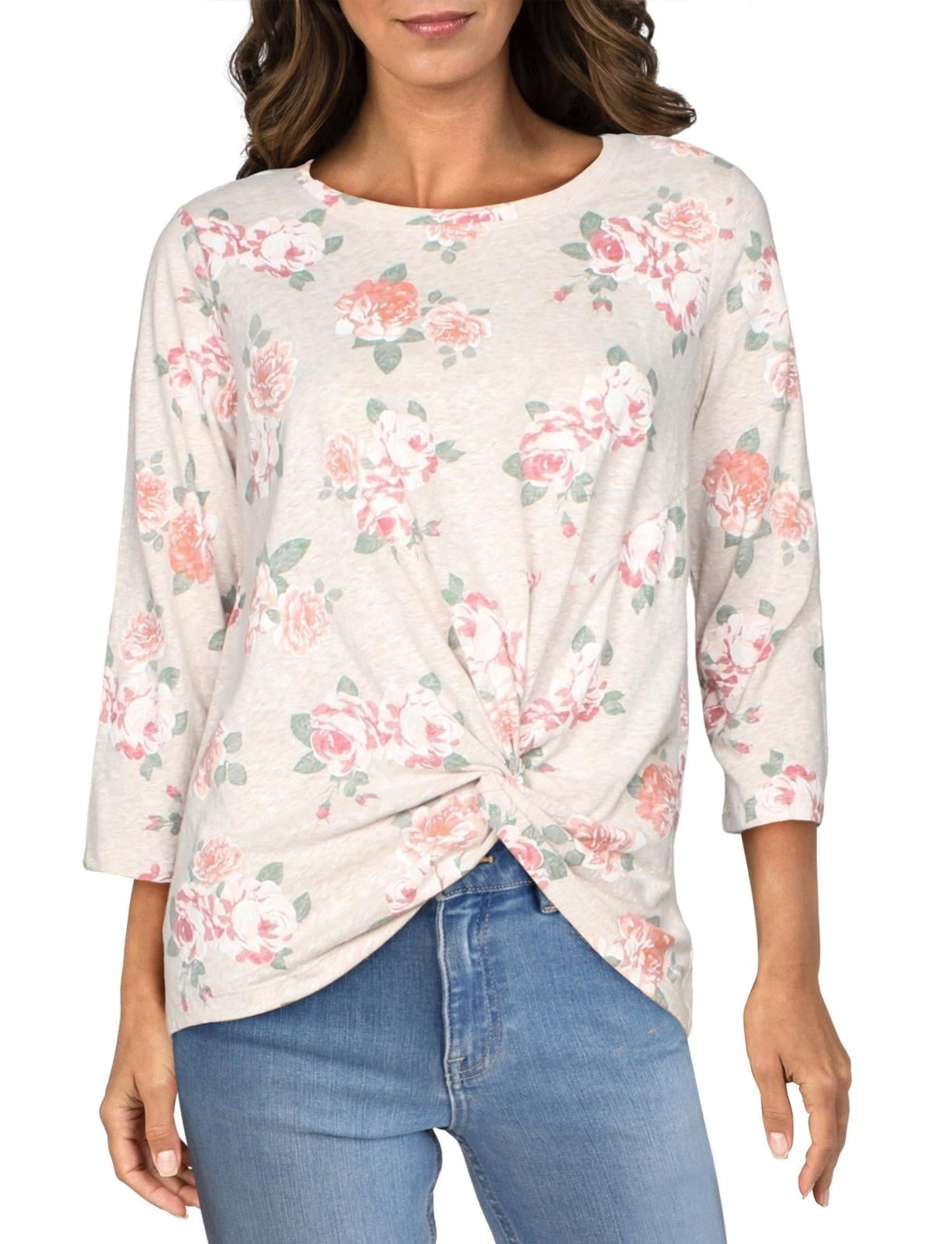Womens Twist Front Floral Long Sleeve Round Neck Top