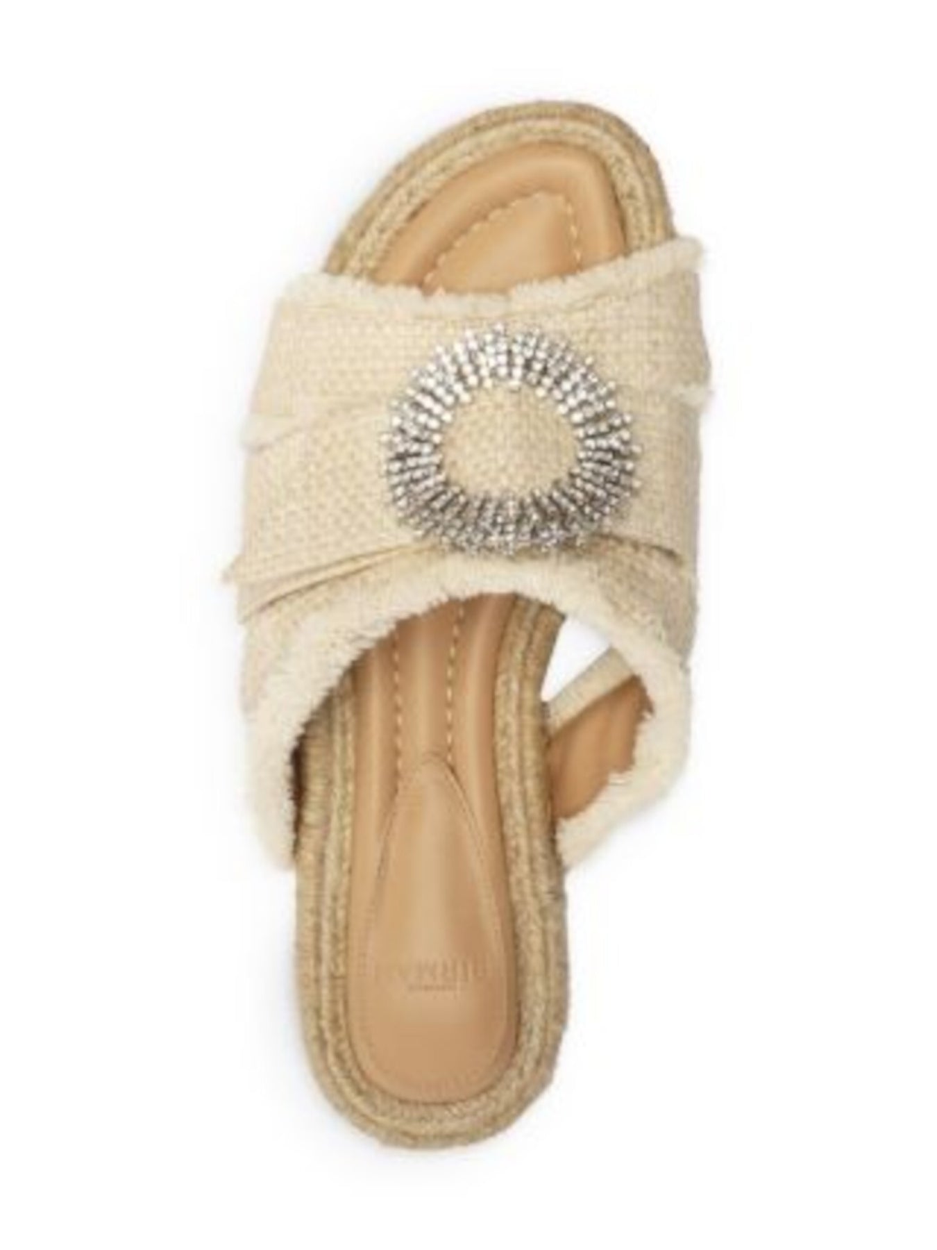 Womens Beige Woven Crystal Starburst Hardware Strappy Fringed Cushioned Madelina Round Toe Platform Slip On Dress Slide Sandals Shoes