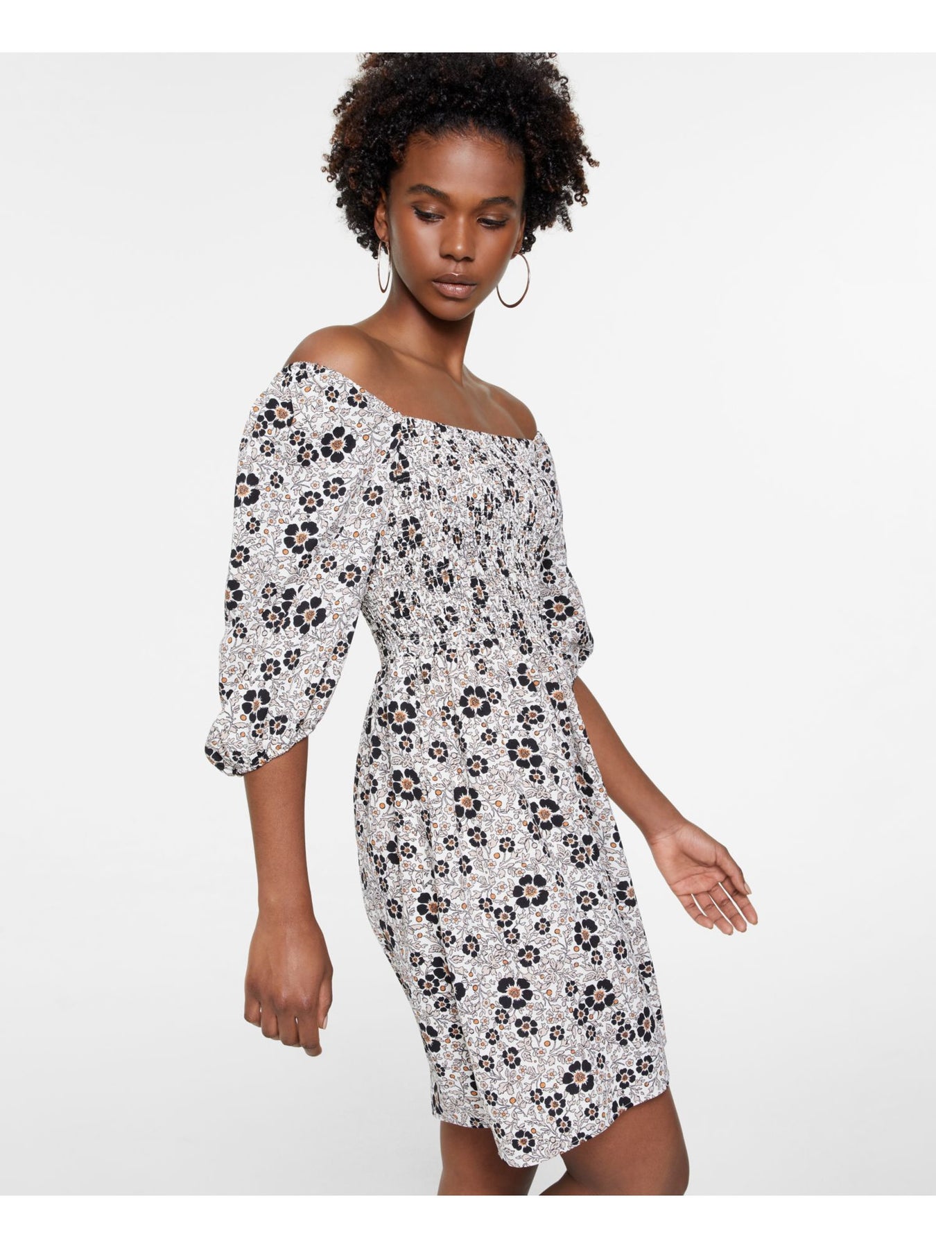 Womens Beige Smocked Pullover Lined Floral 3/4 Sleeve Off Shoulder Short Party Fit + Flare Dress