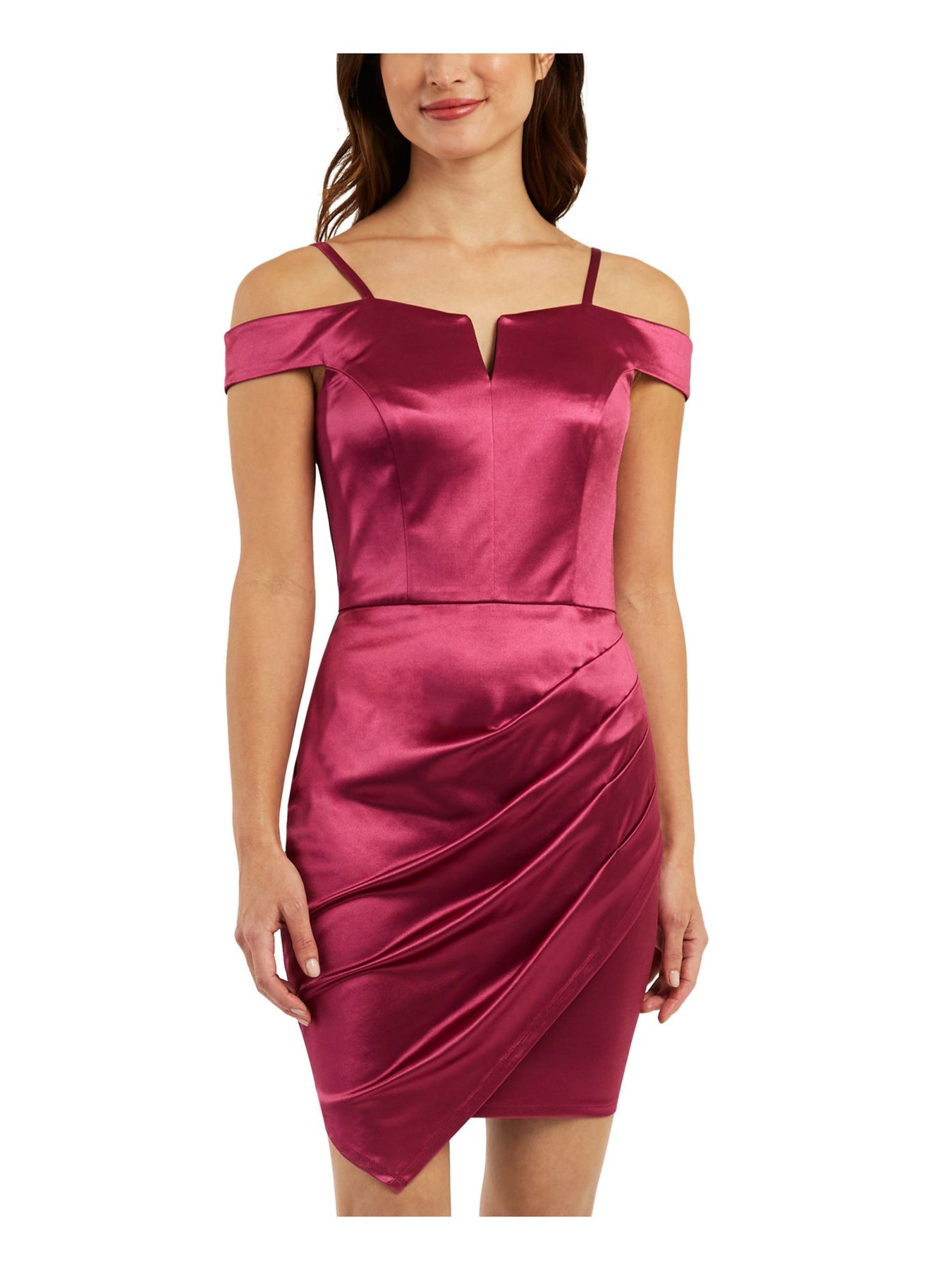 Womens Pink Adjustable Zippered Padded Bust Pleated Lined Cap Sleeve Off Shoulder Above The Knee Party Body Con Dress