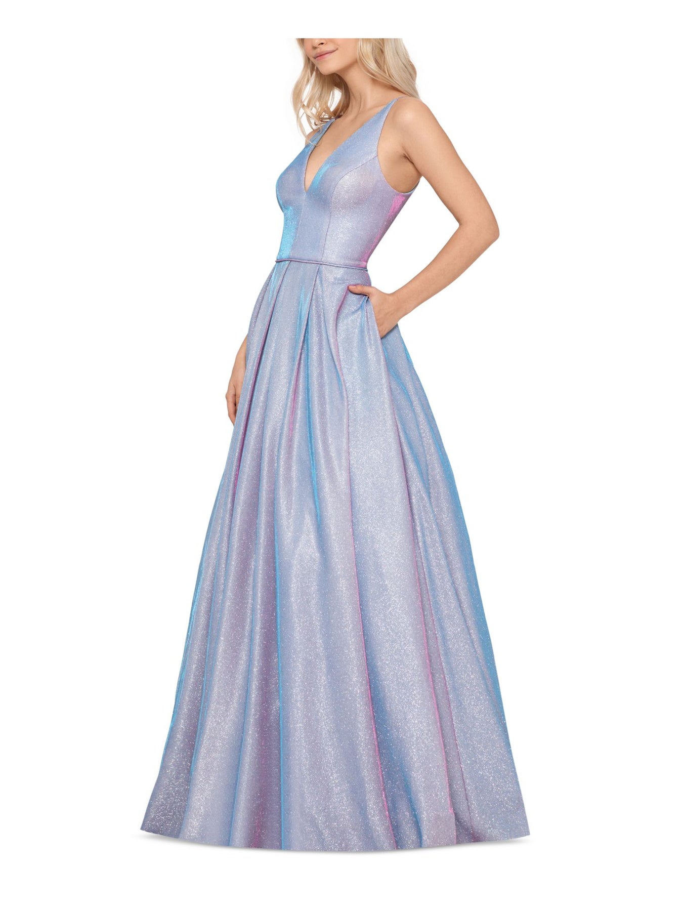 BLONDIE NITES Womens Light Blue Zippered Pleated Pocketed Lined Sleeveless V Neck Full-Length Formal Gown Dress