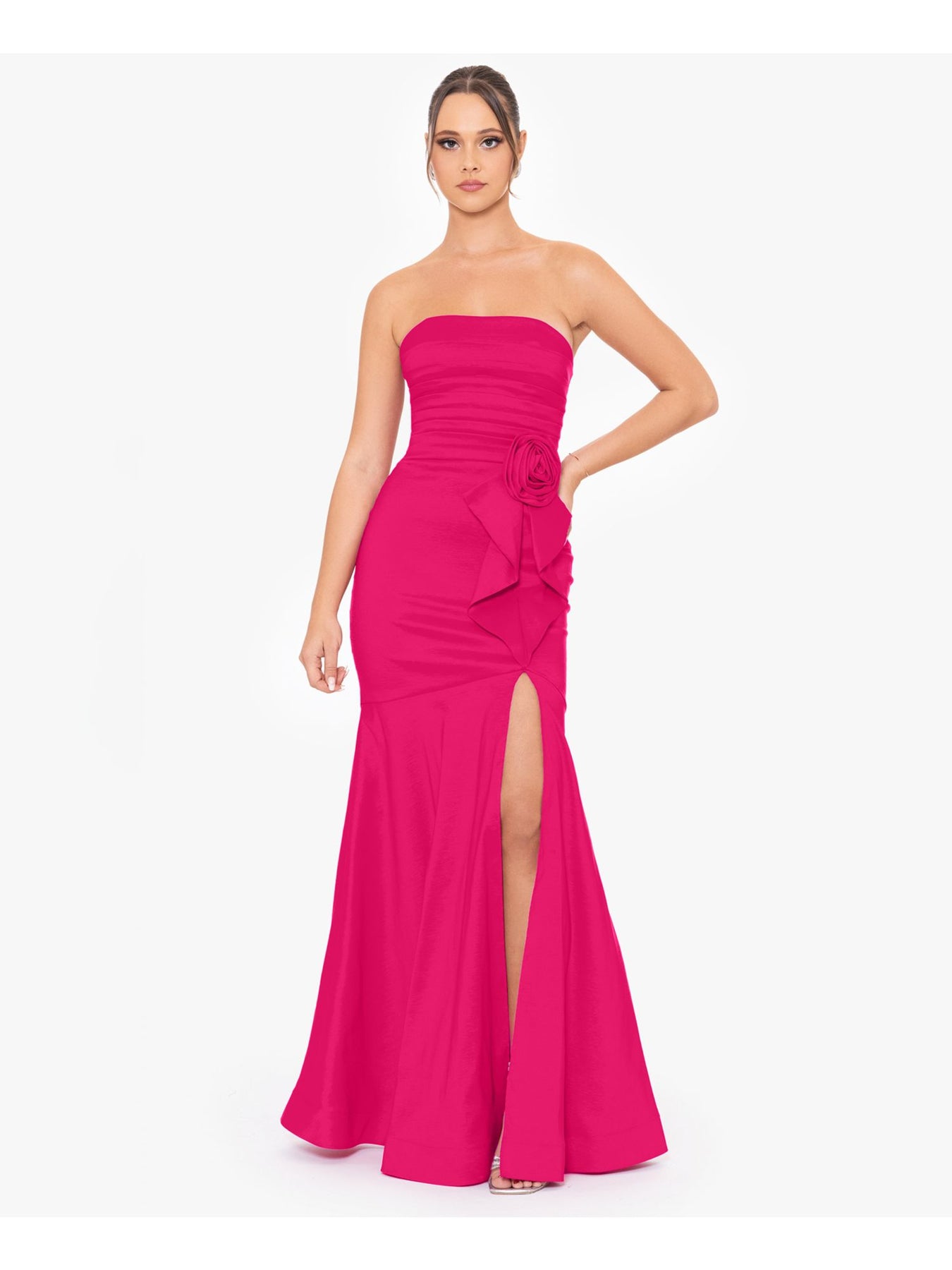 Womens Pink Unlined Slitted Pleated Rosette And Ruffle Accen Sleeveless Strapless Full-Length Formal Gown Dress