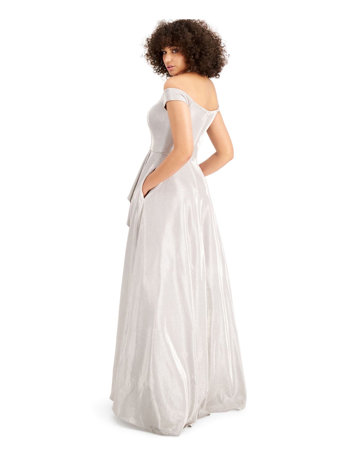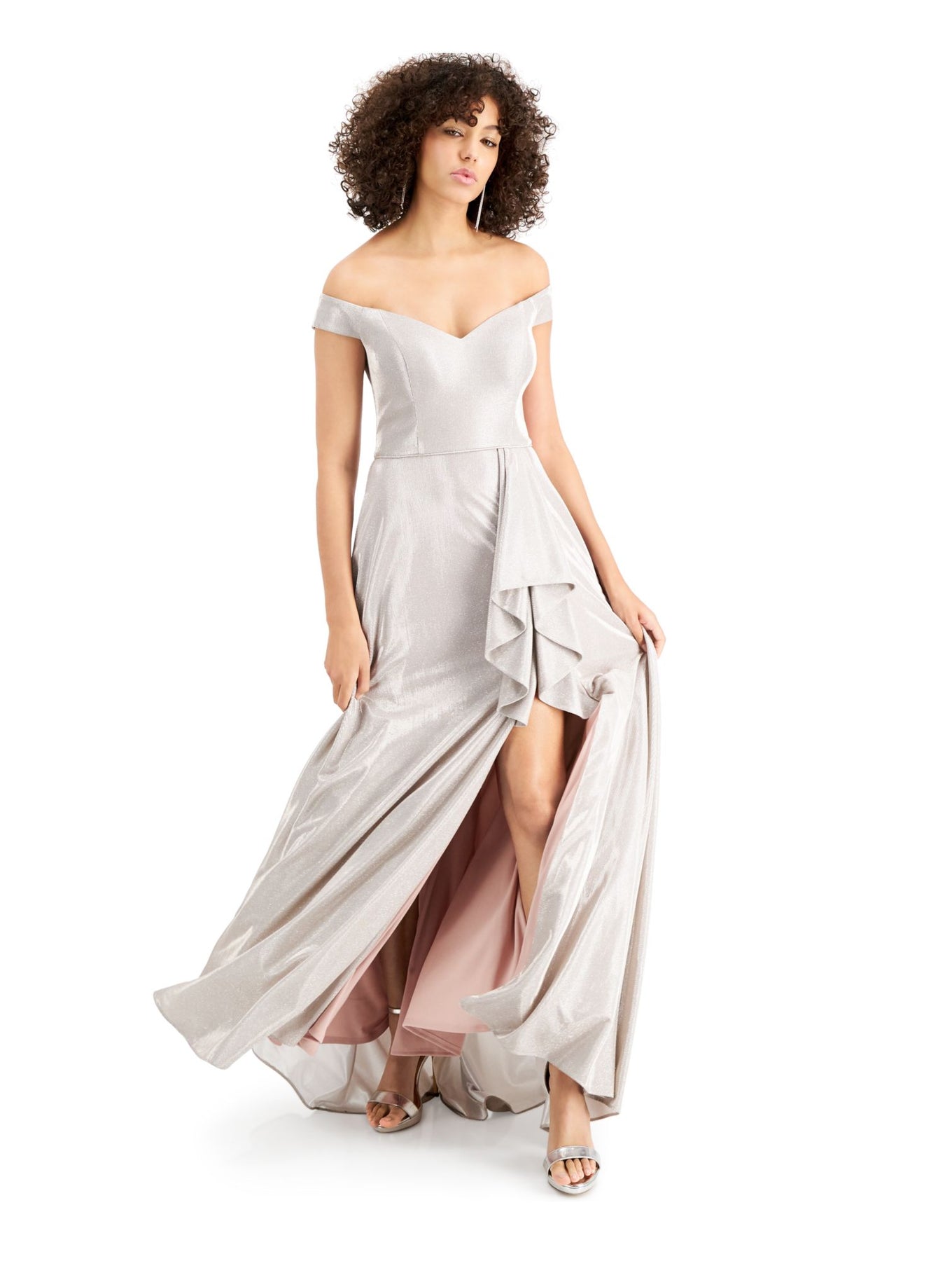Womens Silver Slitted Glitter Off Shoulder Full-Length Formal Fit + Flare Dress