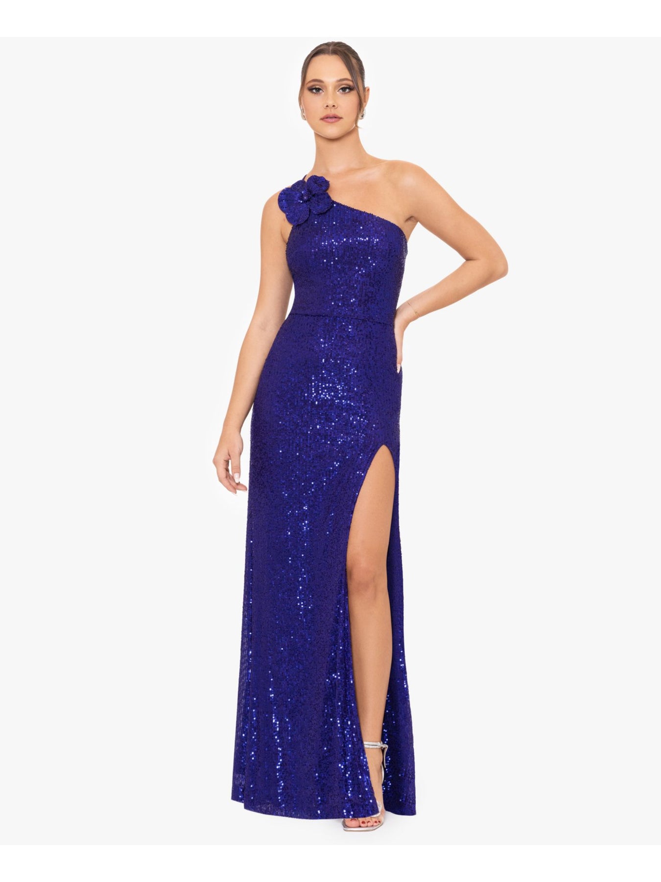BLONDIE NITES Womens Purple Zippered Slitted Rosette Shoulder Lined Sleeveless Asymmetrical Neckline Full-Length Formal Gown Dress Juniors 1
