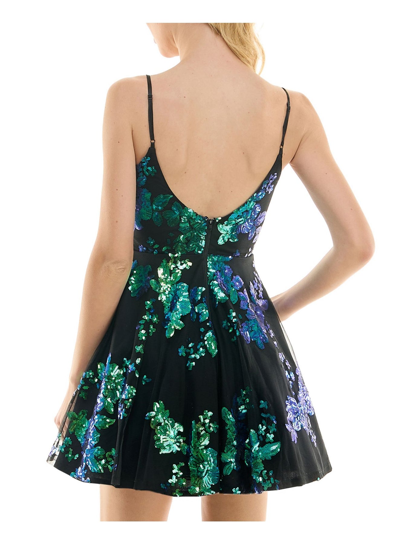 Womens Black Sequined Lined Adjustable Straps Zippered Padde Spaghetti Strap V Neck Above The Knee Party Fit + Flare Dress
