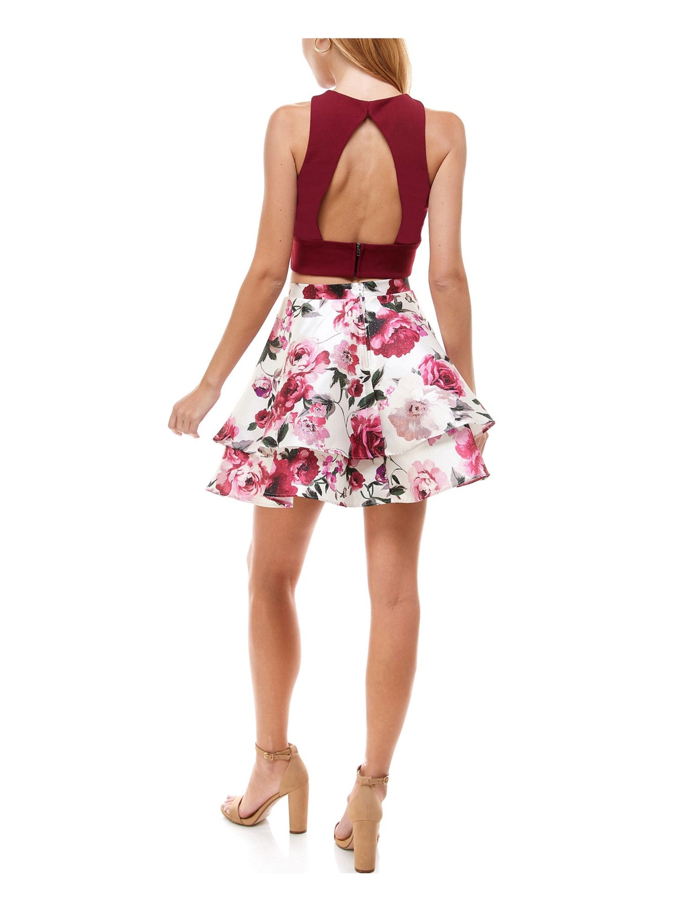 Womens Burgundy Floral Sleeveless Jewel Neck Mini Party Fit + Flare Dress