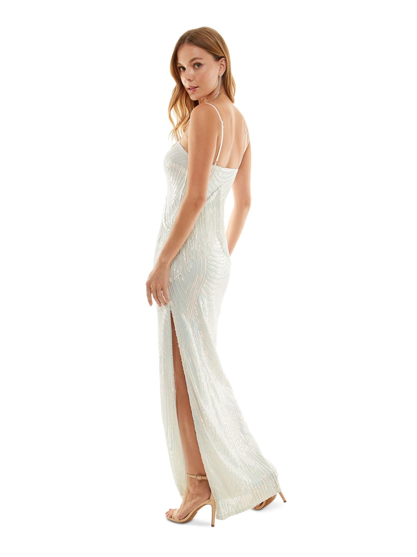Womens Ivory Zippered Lined Fringed Sequined Slit Spaghetti Strap Square Neck Full-Length Formal Gown Dress