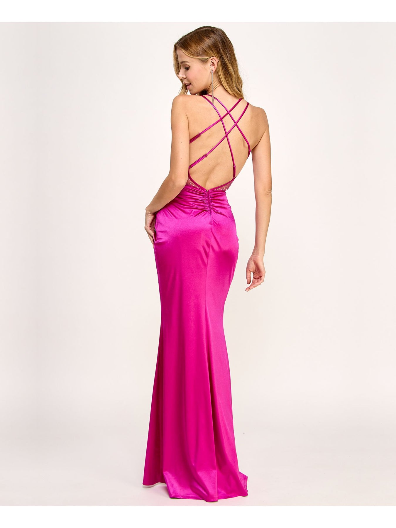 Womens Purple Gathered Zippered Crisscross Open Back High-slit Sleeveless Sweetheart Neckline Full-Length Prom Gown Dress