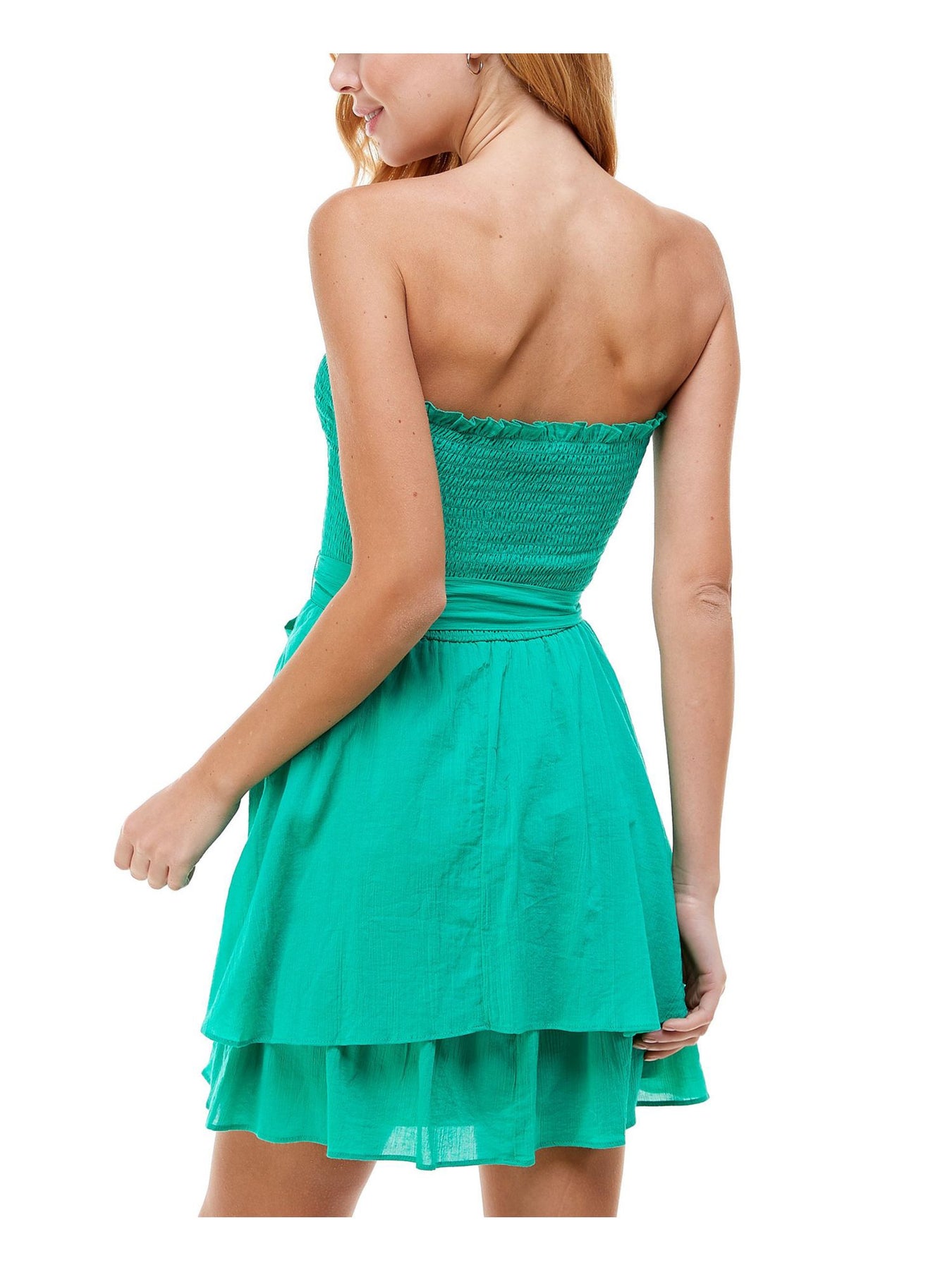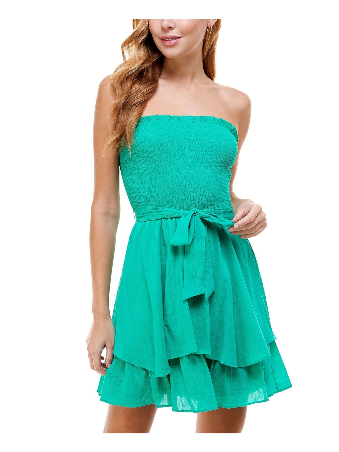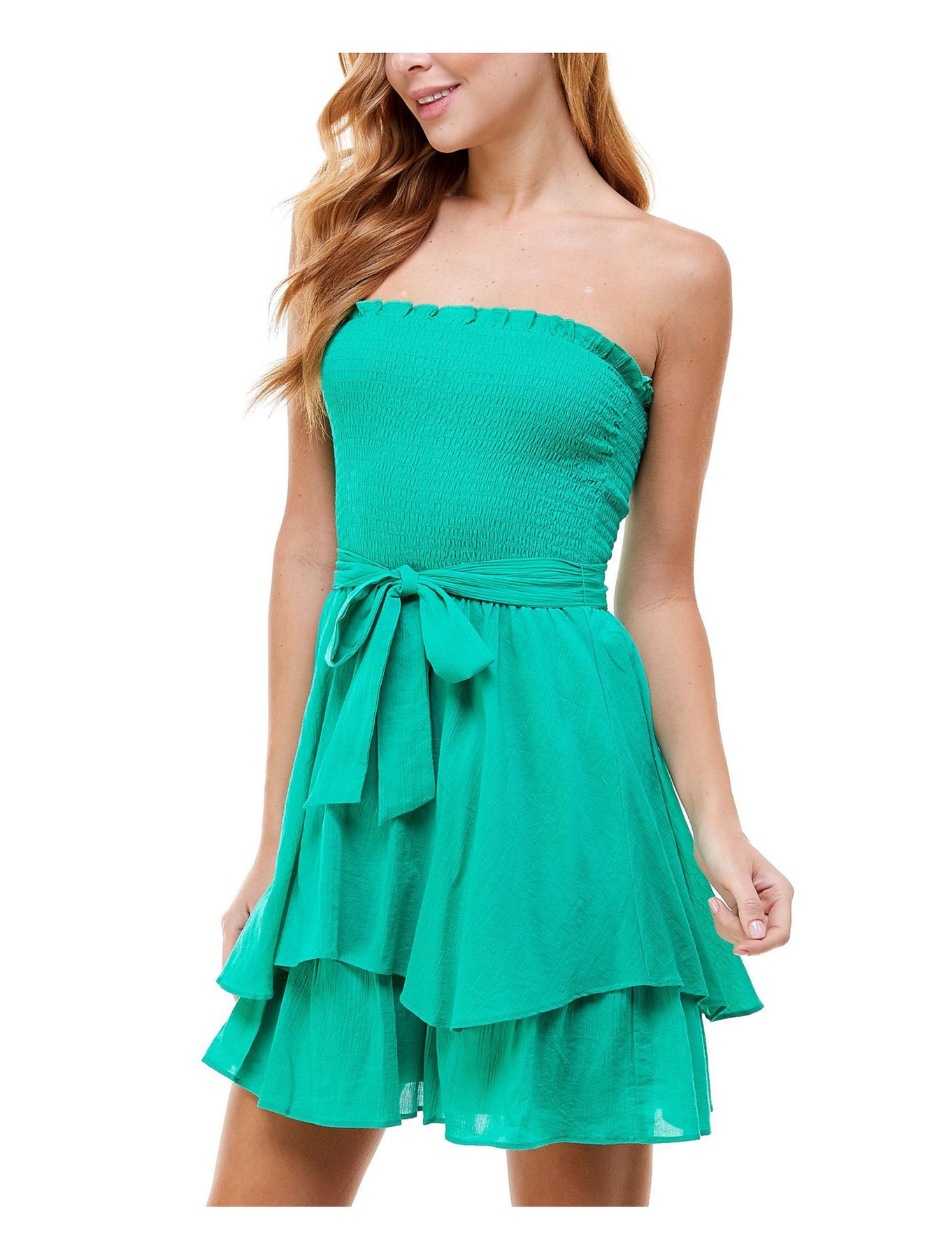CITY STUDIO Womens Green Ruffled Tie Smocked Strapless Short Party Fit + Flare Dress S