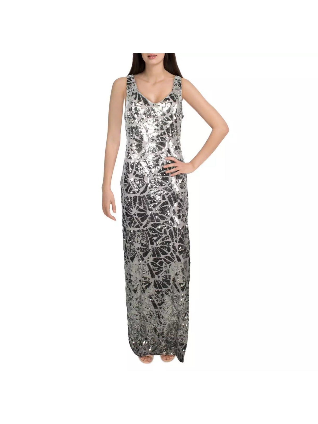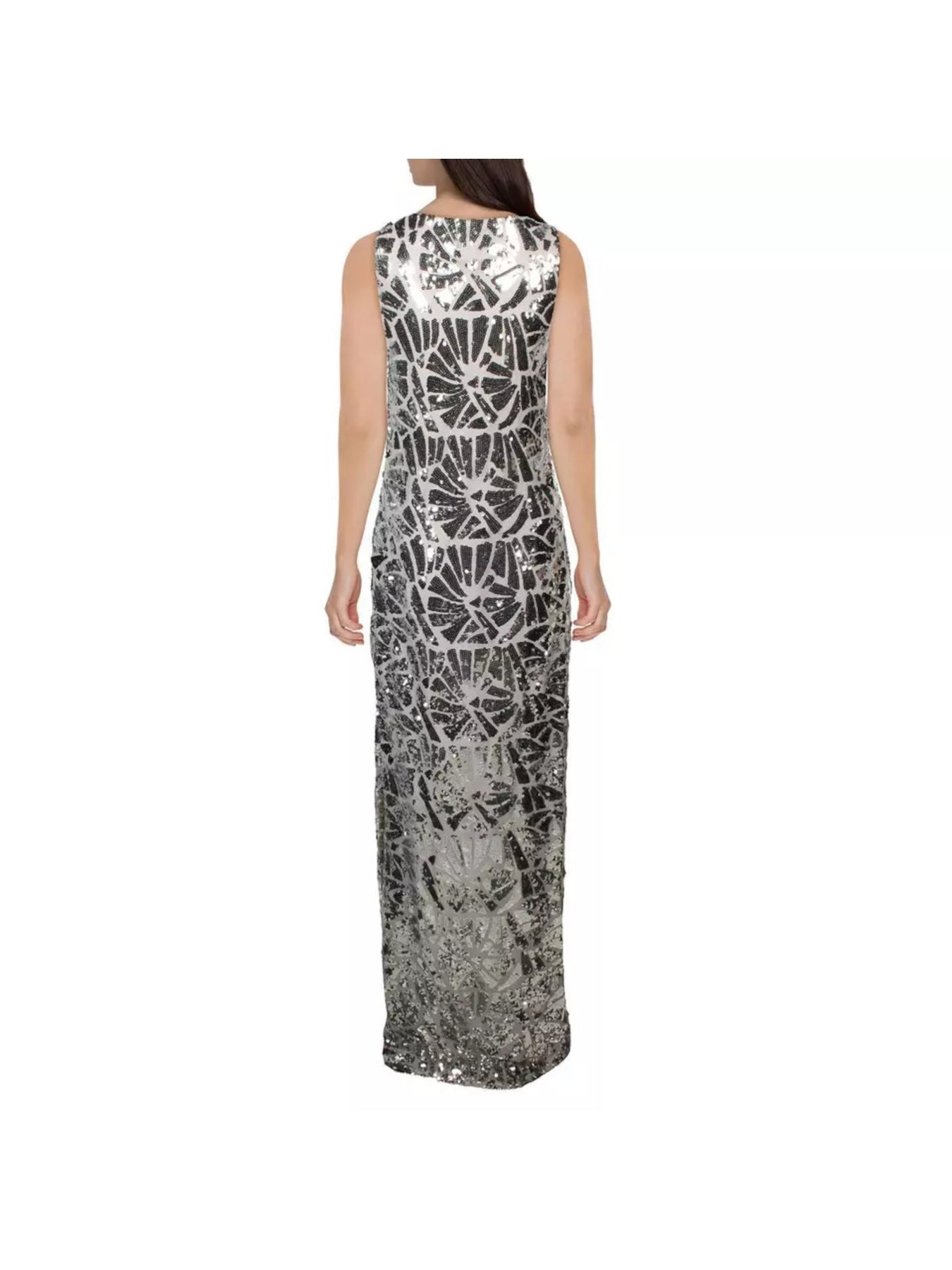 Womens Silver Mesh Sequined Slitted Lined Darted Pull-over Geometric Sleeveless Scoop Neck Full-Length Formal Sheath Dress