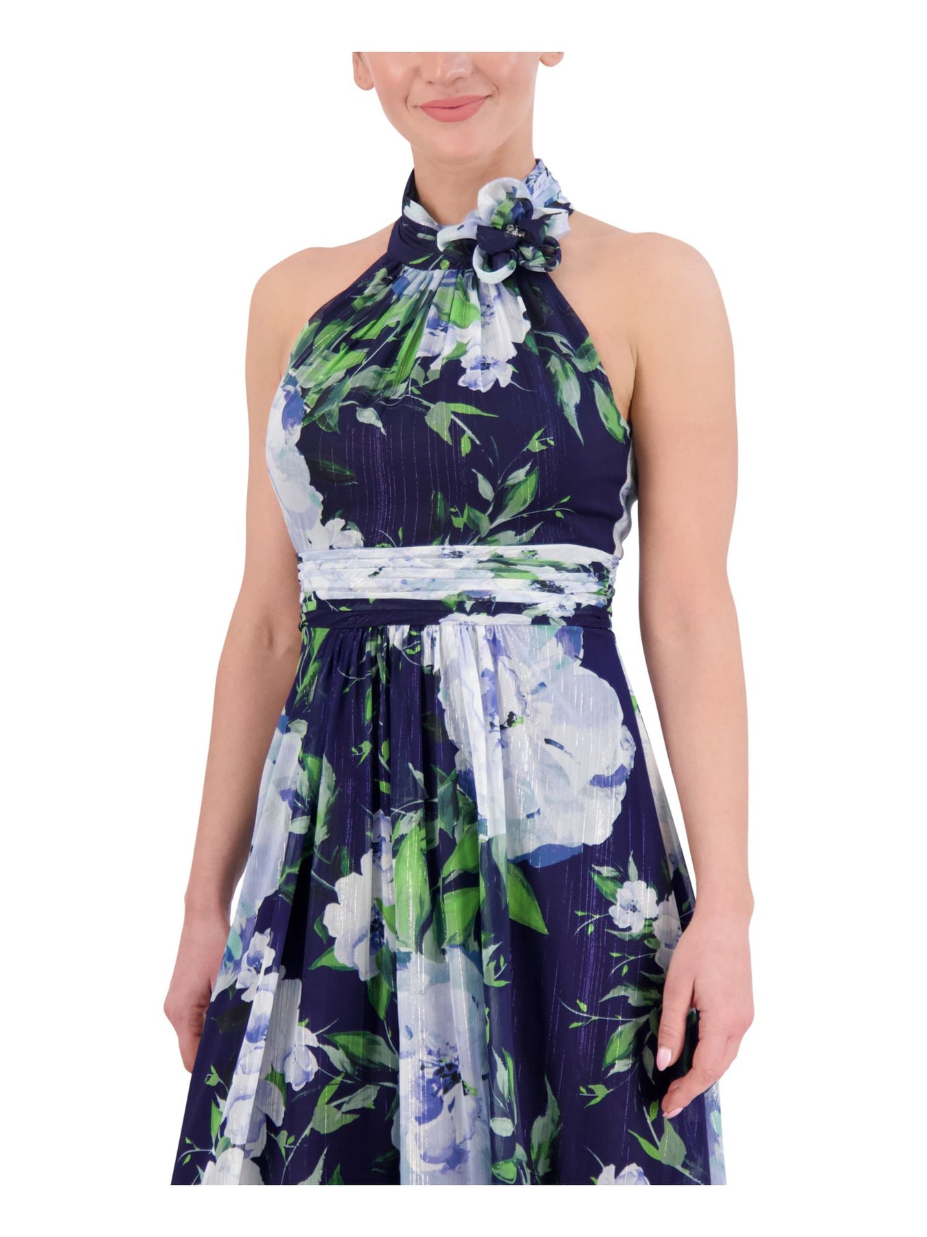 ELIZA J Womens Navy Embellished Metallic Hi-lo Hem Lined Zippered Pleated Floral Sleeveless Halter Full-Length Party Sheath Dress 2