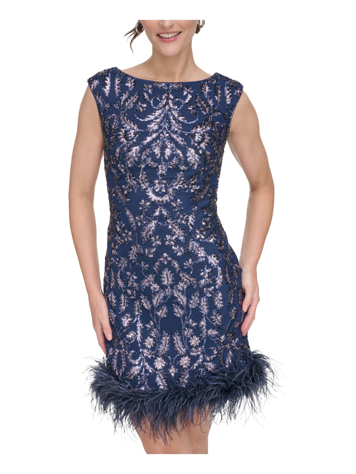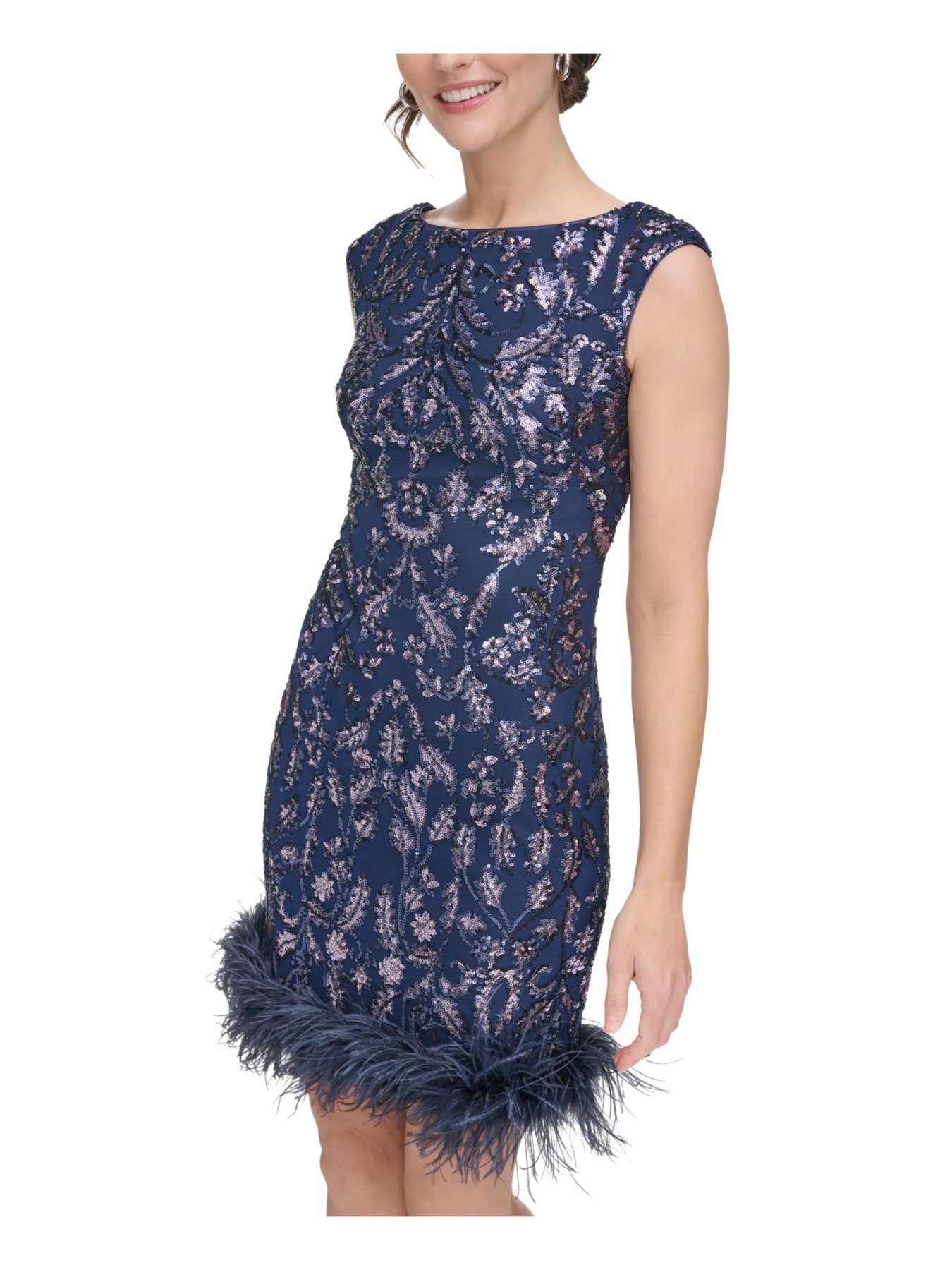 ELIZA J Womens Navy Zippered Lined Feather Trimmed Hem Cap Sleeve Boat Neck Short Party Sheath Dress