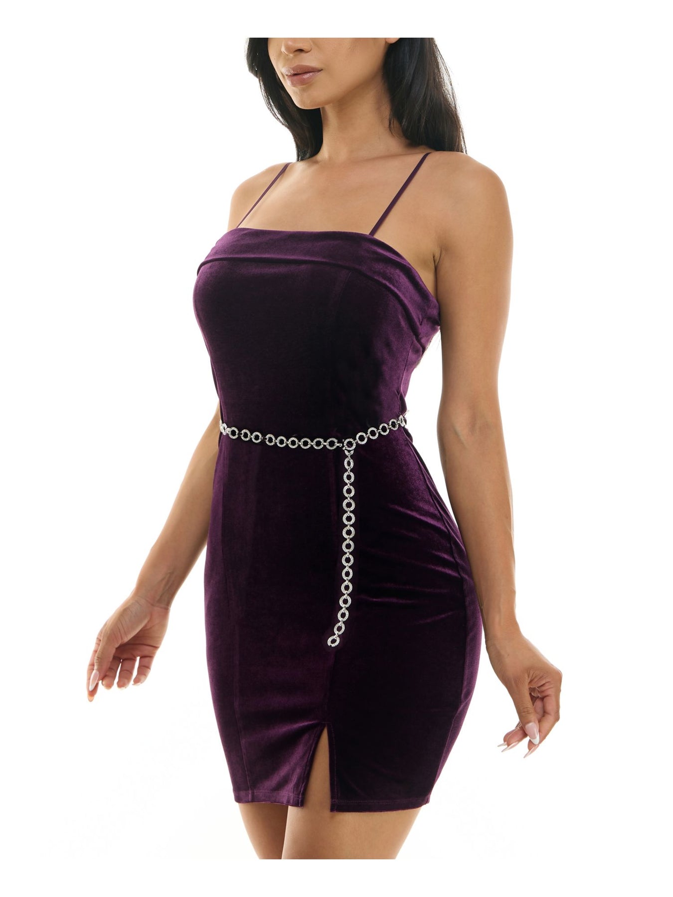 Womens Purple Unlined Chain Belt Pullover Spaghetti Strap Square Neck Short Party Body Con Dress