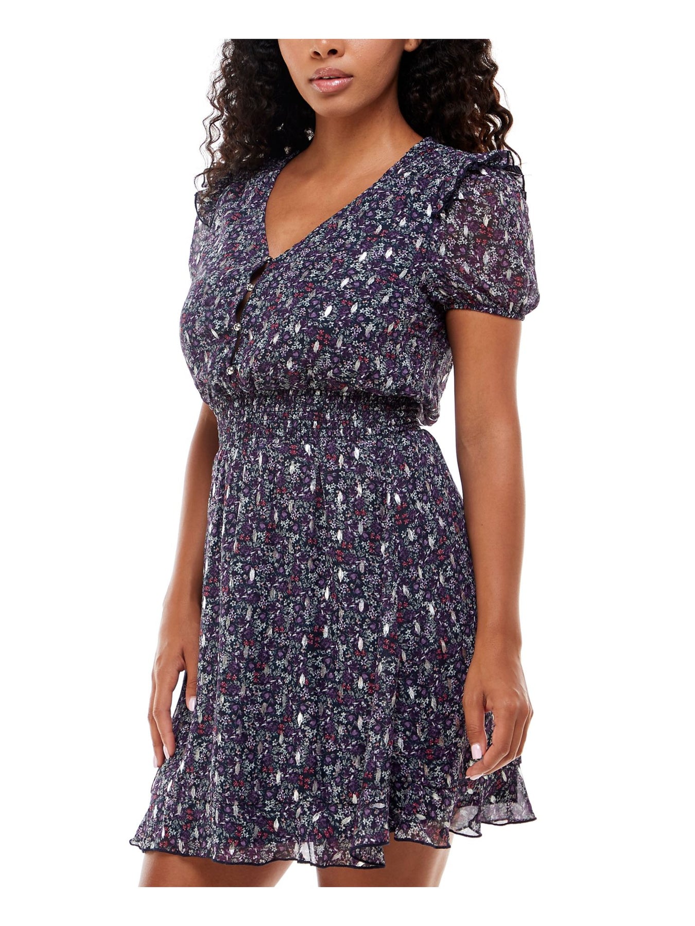 EMERALD SUNDAE Womens Smocked Button Front  Pullover Short Sleeve V Neck Short Party Fit + Flare Dress