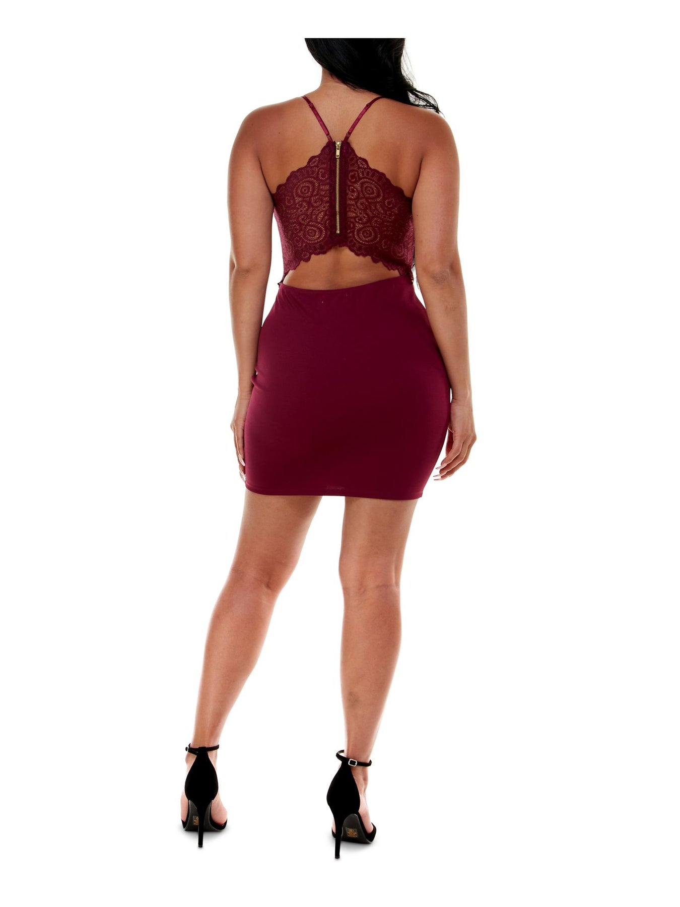 EMERALD SUNDAE Womens Burgundy Stretch Zippered Lace Cut-out Back Cupped Spaghetti Strap Square Neck Short Party Body Con Dress S