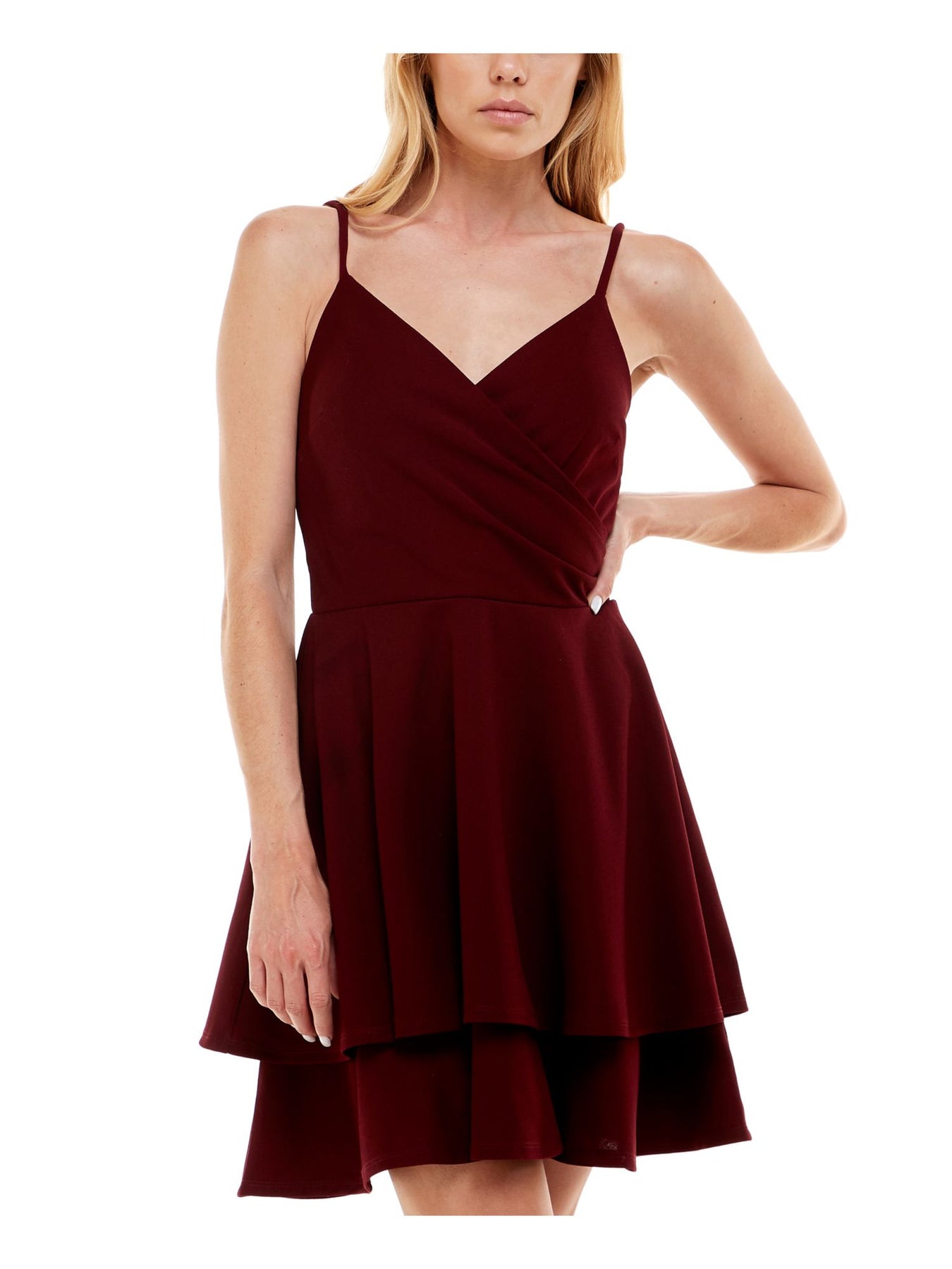 EMERALD SUNDAE Womens Maroon Zippered Spaghetti Strap Surplice Neckline Above The Knee Party Ruffled Dress L