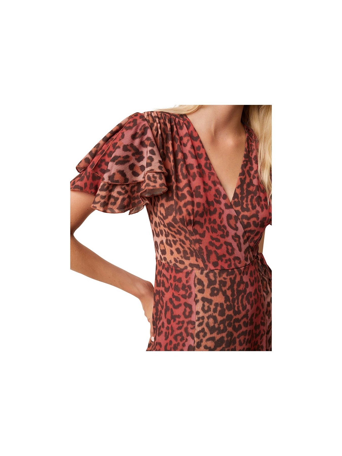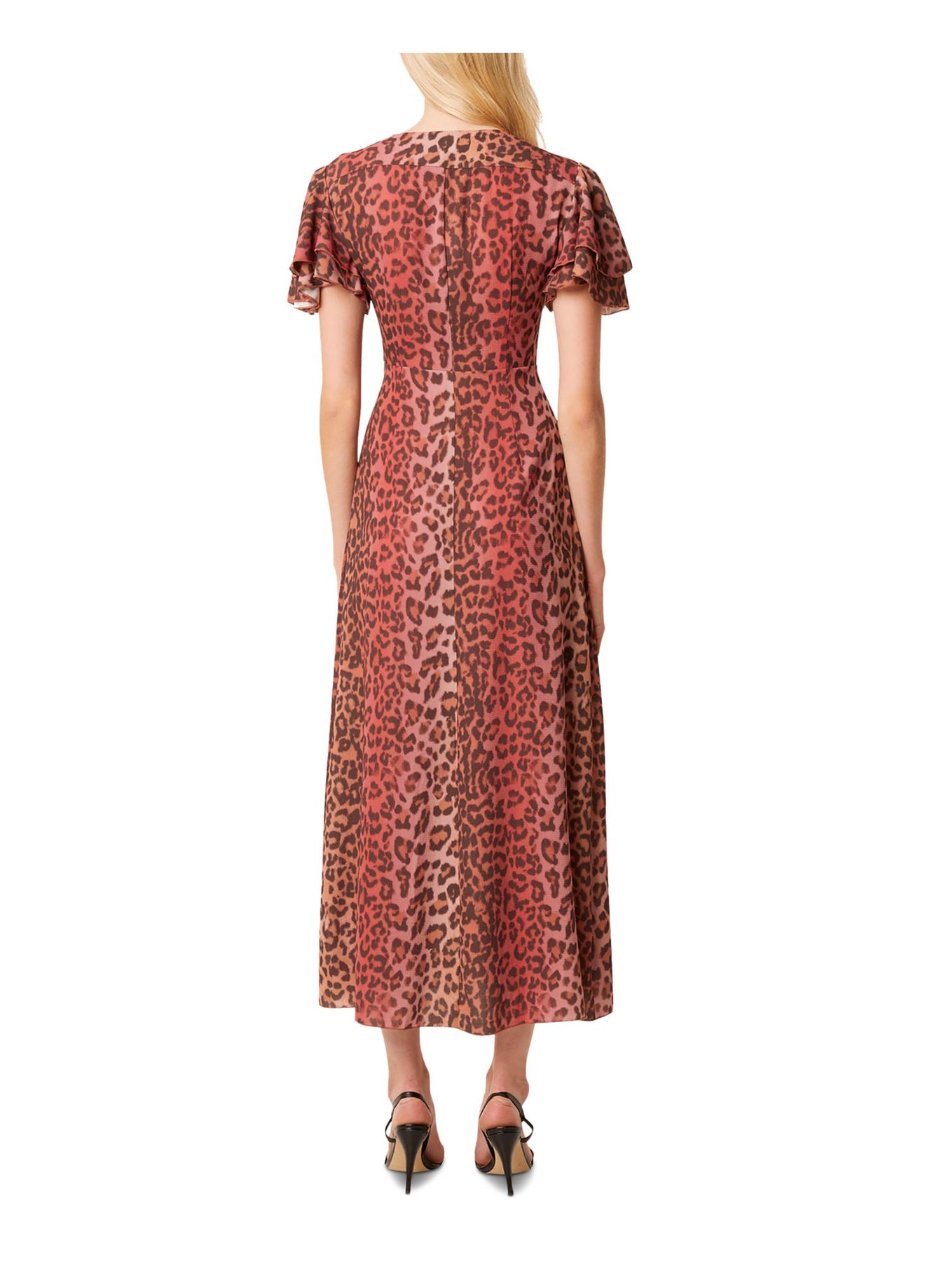 Womens Brown Zippered Tie Unlined Animal Print Flutter Sleeve Surplice Neckline Tea-Length Party Faux Wrap Dress