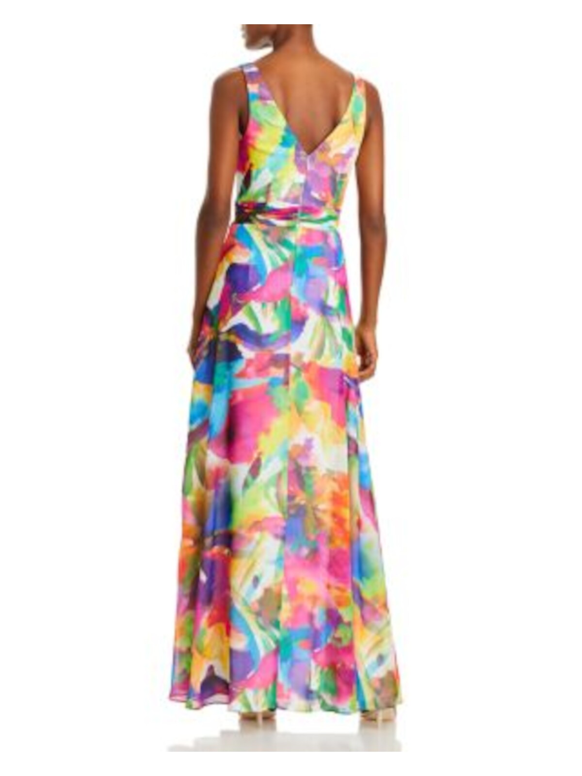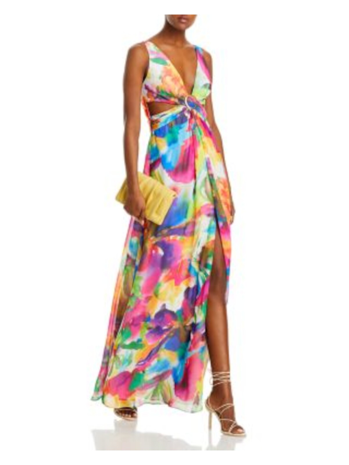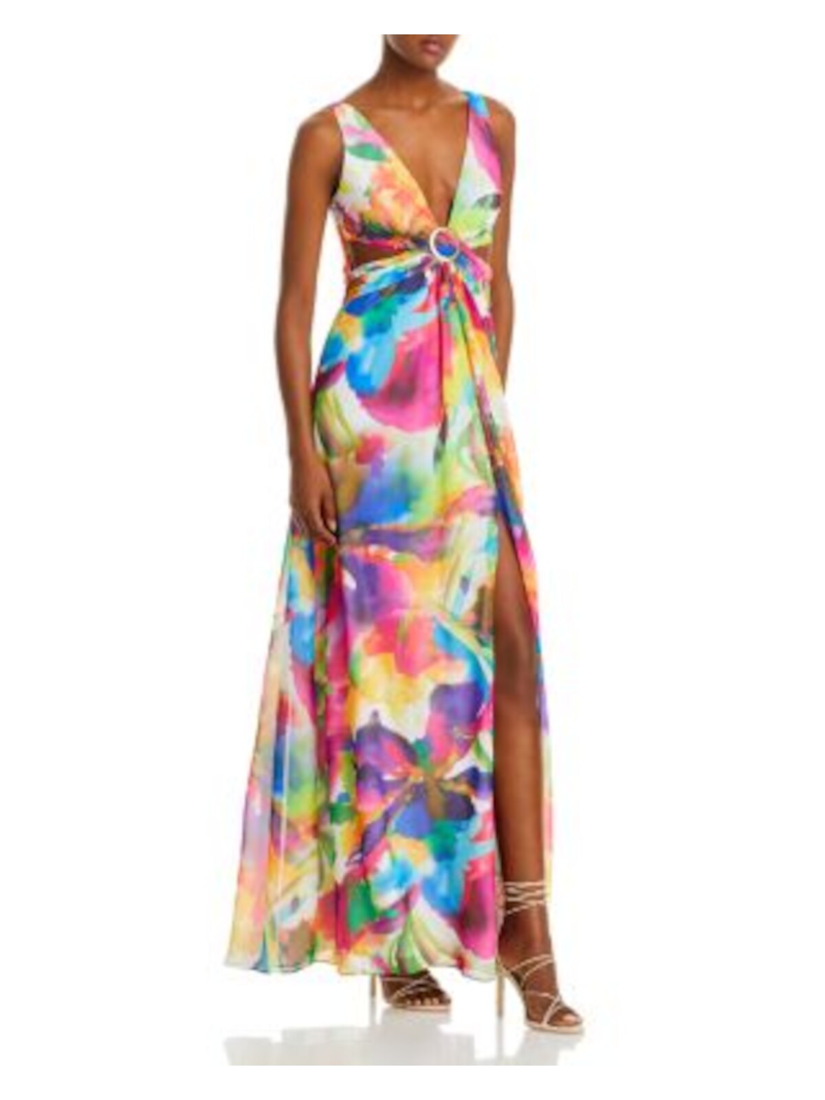 Womens White Cut Out Zippered Pleated O-ring Front High Slit Printed Sleeveless V Neck Full-Length Party Gown Dress