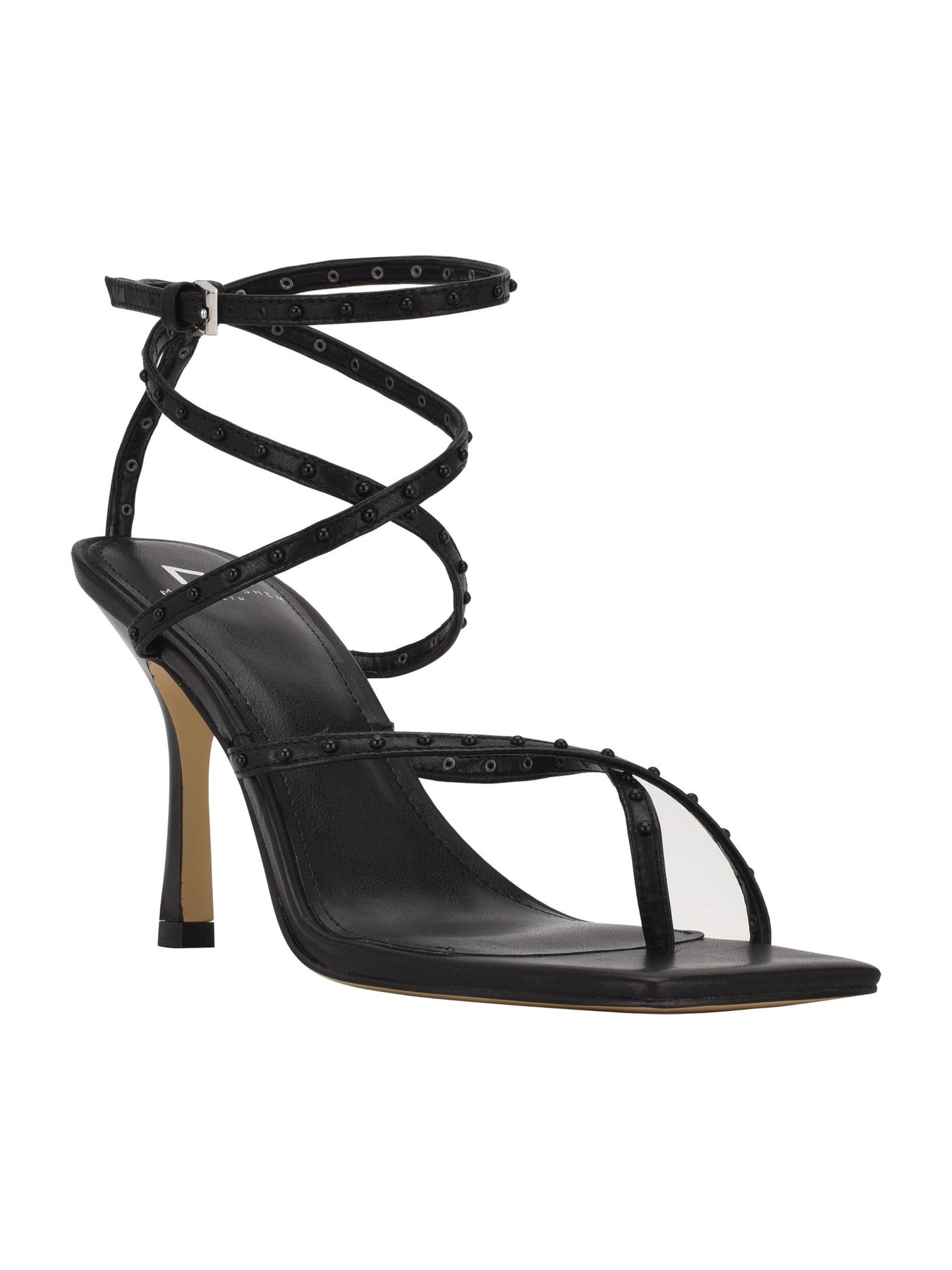 Womens Black Padded Studded Ankle Strap Dallin Square Toe Stiletto Buckle Leather Heeled M