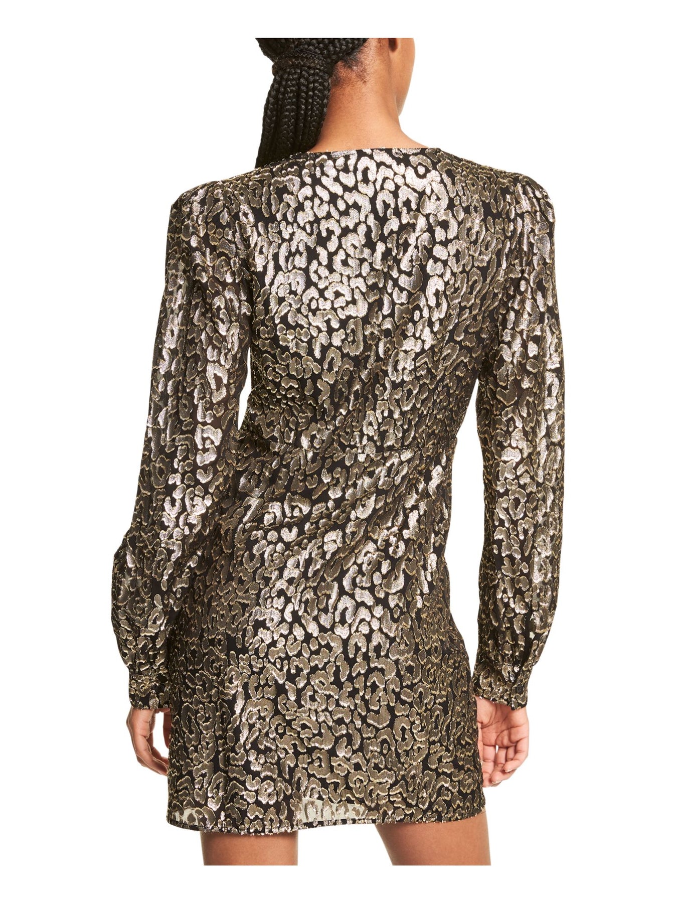 Womens Black Metallic Gathered Buttoned Cuffs Zippered Lined Animal Print Blouson Sleeve V Neck Mini Party Sheath Dress
