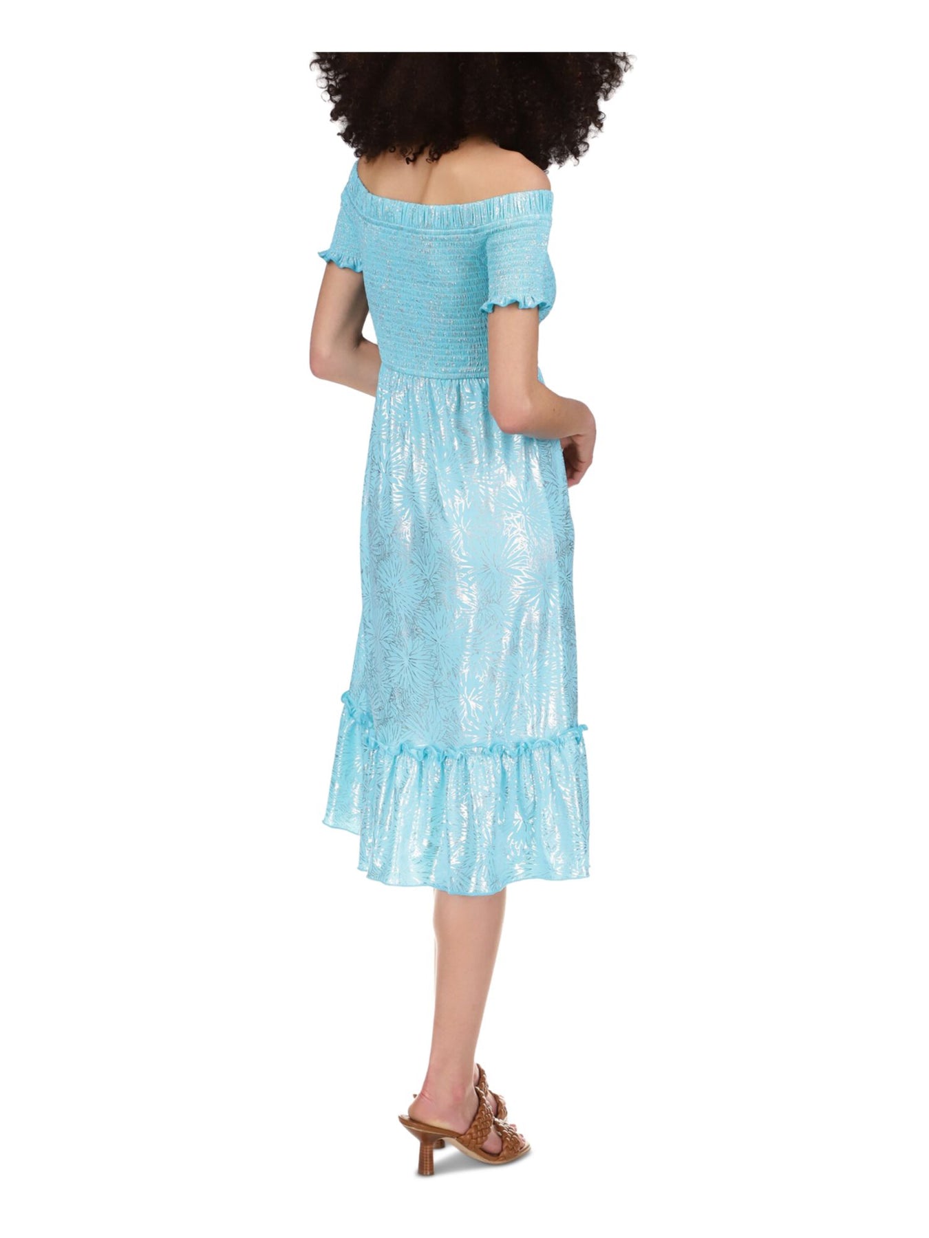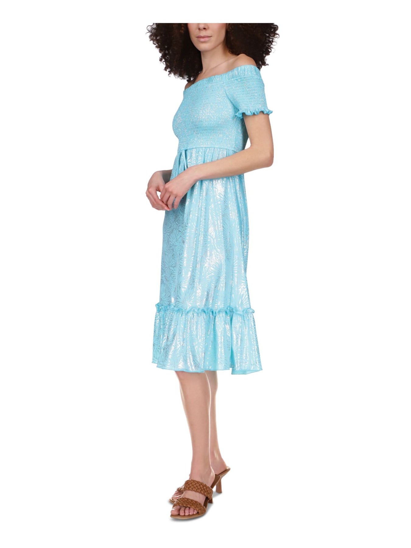Womens Turquoise Smocked Ruffled Drawstring Waist Short Sleeve Off Shoulder Midi Party Fit + Flare Dress