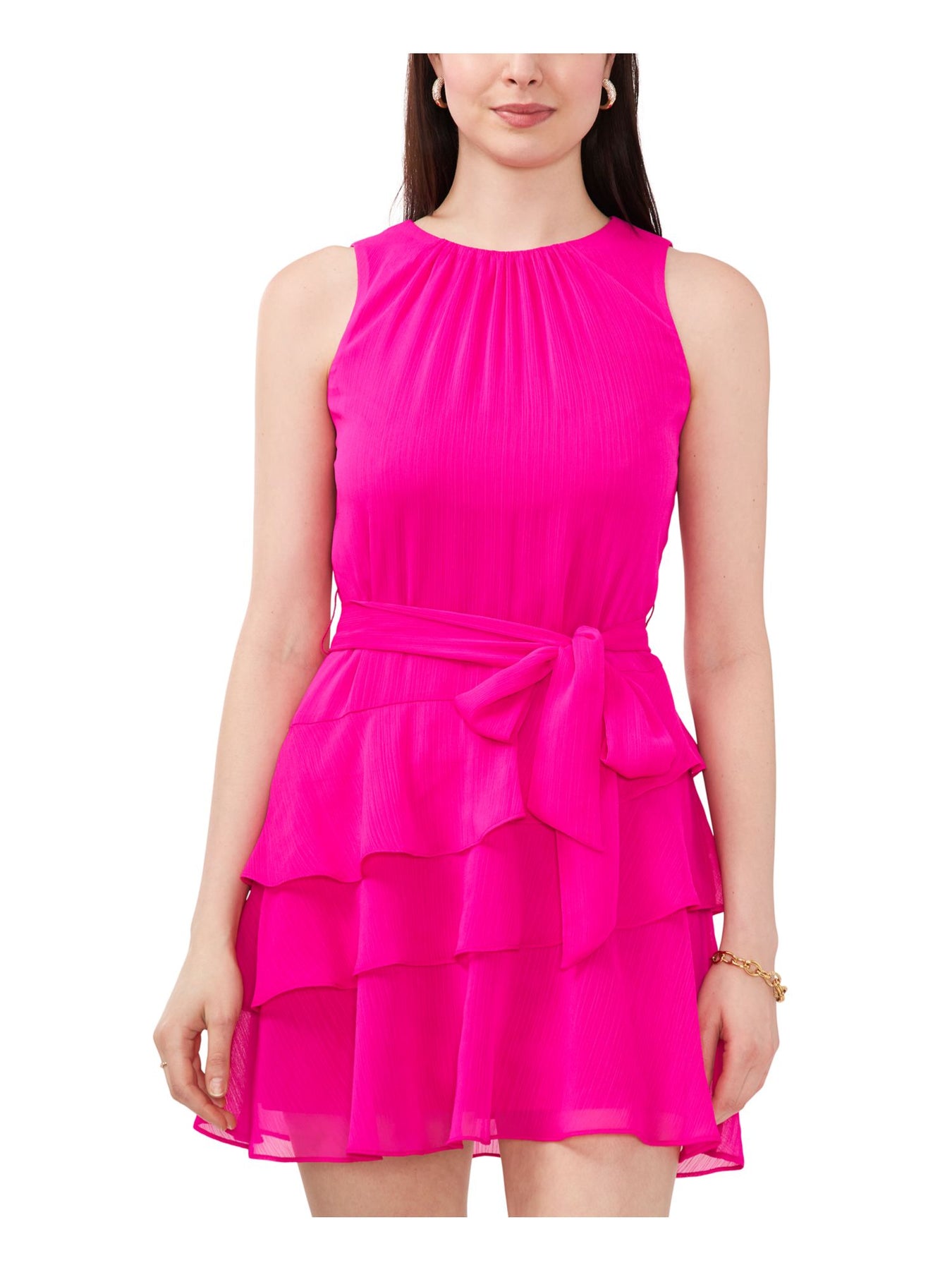 Womens Pink Gathered Ruffled Keyhole Back Tie-Belt Sleeveless Round Neck Short Party Fit + Flare Dress