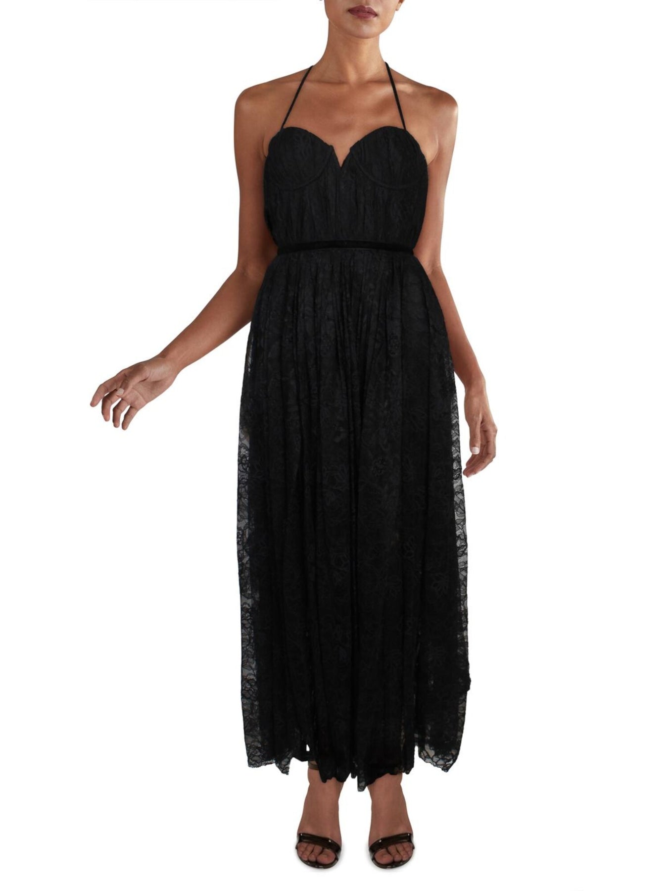 SAU LEE Womens Black Stretch Lace Zippered Pleated Spaghetti Strap Sweetheart Neckline Midi Evening Fit + Flare Dress 0