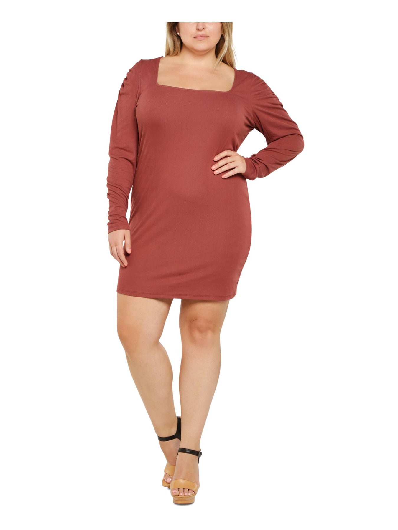 ULTRA FLIRT Womens Pink Stretch Ribbed Ruched-sleeve Long Sleeve Square Neck Mini Cocktail Body Con Dress Plus 1X