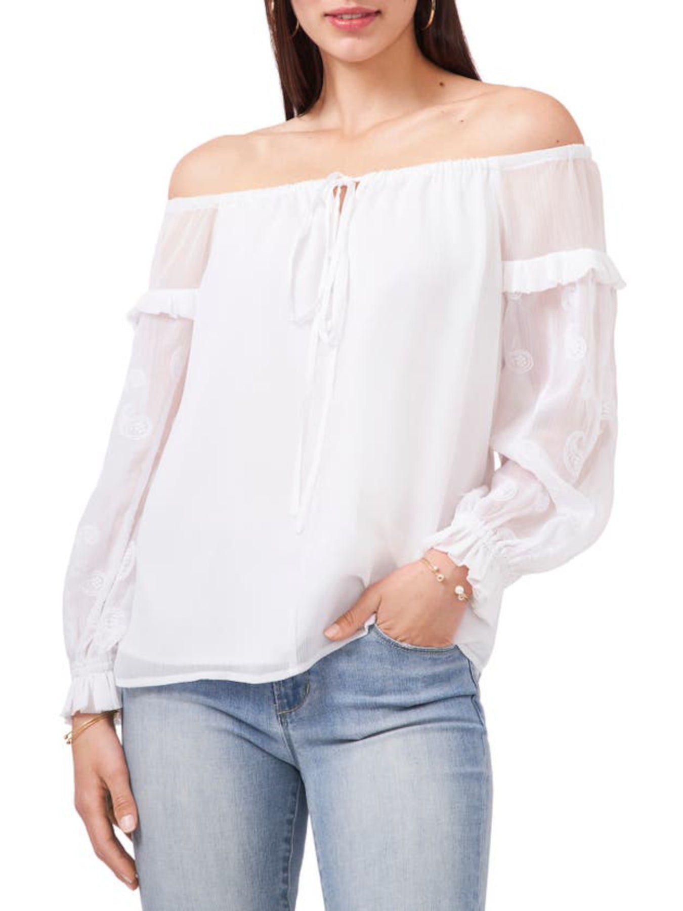 Womens Embroidered Blouson Sleeve Off Shoulder Peasant Top